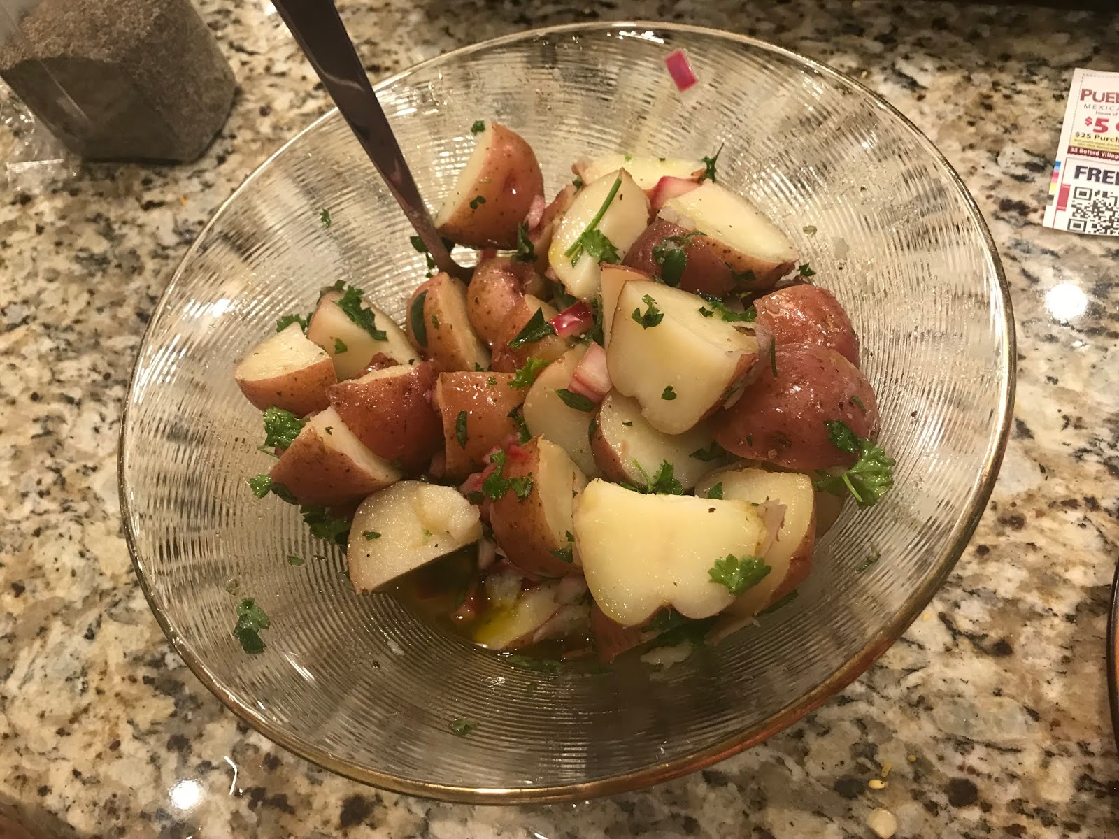 Whisk onions, oil, vinegar, parsley, oregano, salt, and pepper in a bowl; pour over potatoes. Serve warm.