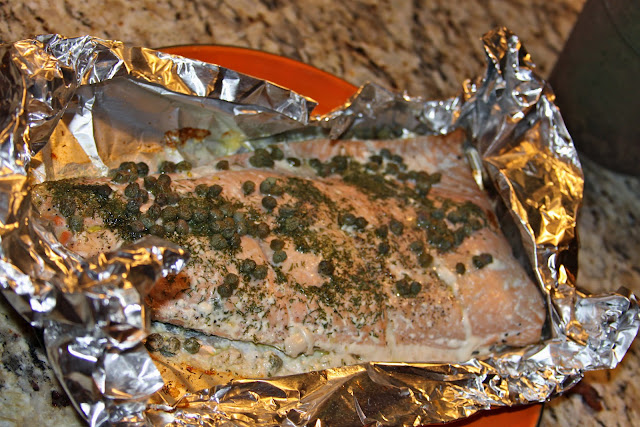 Easiest recipe there is!  Place a salmon filet on a piece of tin foil, skin side down. Sprinkle with salt and pepper.  Then drizzle with Extra Virgin Olive Oil, lemon juice, white wine.  Top with capers and dill.  Place on the grill until flakey ~ 8-10 minutes, depending on the thickness of your salmon.  Delish!
