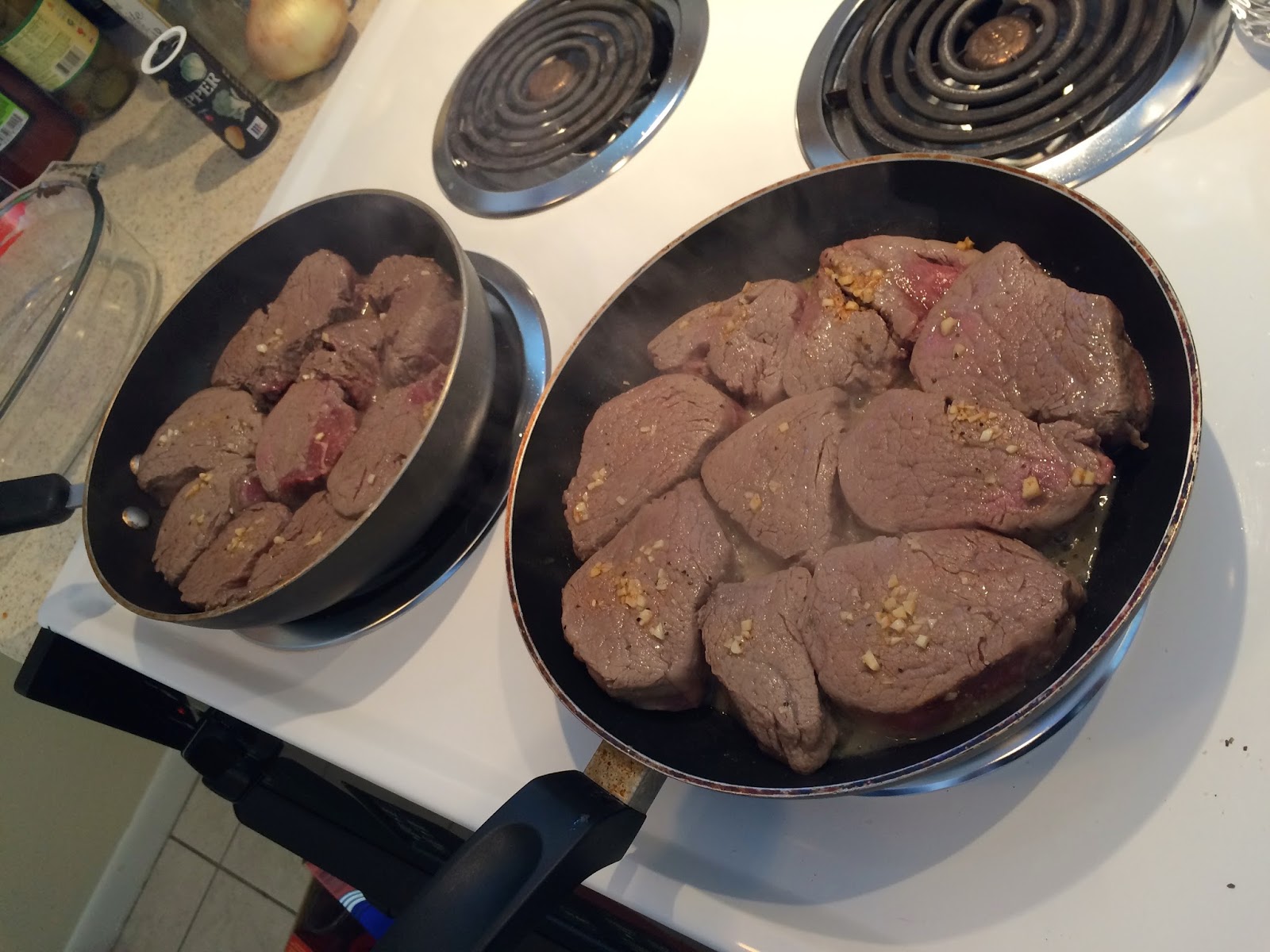 Heat 1 TBSP butter in a large skillet until hot. Saute steaks over medium high heat until brown on each side, but still raw in the center. Don’t crowd. If butter begins to burn, reduce heat.