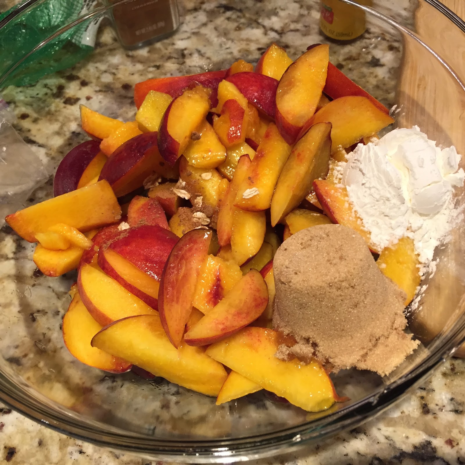 Transfer to an 8- or 9-inch shallow baking dish. Crumble the topping over the peach mixture.
