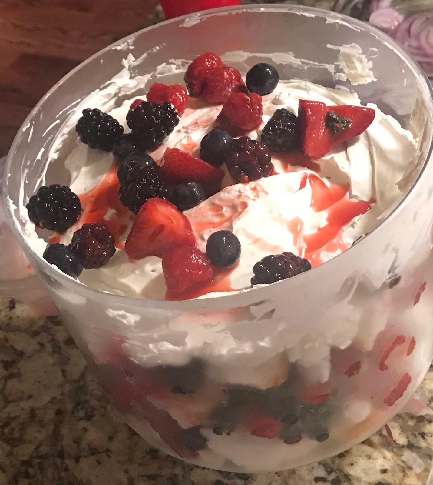 I’ve been preparing this trifle for years – it was my mother’s recipe, and you can use whatever fruit you like, but my daughter made this one and used red and blue fruit for the holiday.