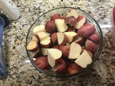 Cut potatoes into even pieces and place in a large pot of bowling water. Boil roughly 10 minutes (or until soft when pricked with a fork – you don’t want them overdone).