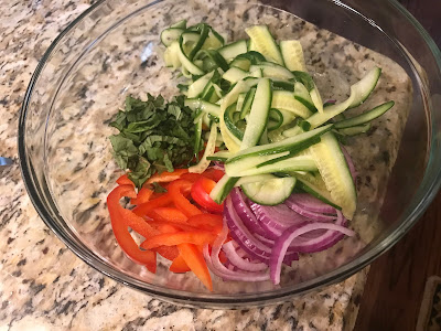 Add cucumbers, peppers, onion, feta, if using, and basil; toss to coat.