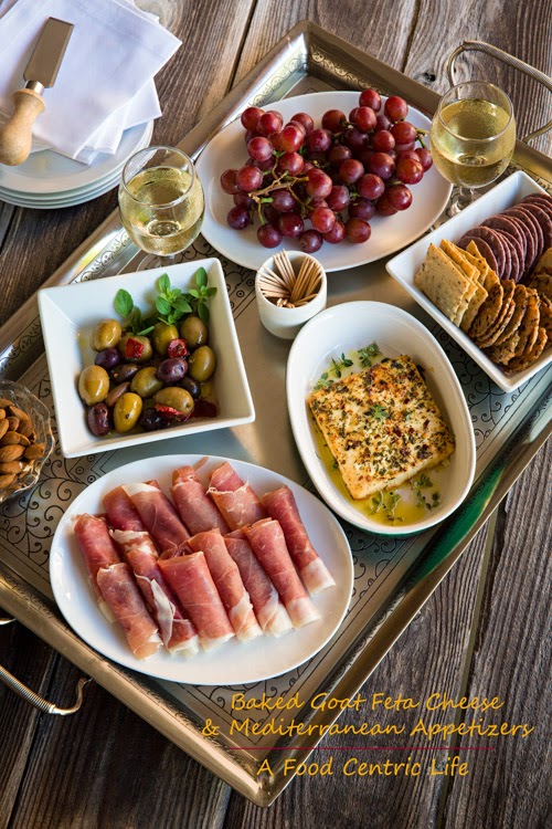 This Mediterranean-inspired appetizer tray is easy to assemble and has something for everyone to nibble before dinner. The goat feta cheese takes just a few minutes and can be served with crackers or thinly sliced baguette.