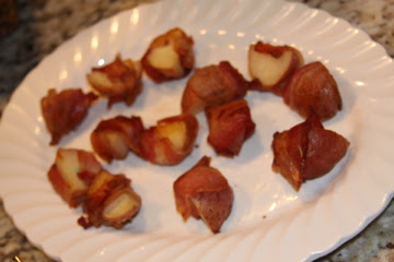 Cut the strips of bacon into thirds. Wrap each potato bite in a piece of bacon, securing it with a toothpick. Put the potatoes on a baking sheet lined with parchment paper or aluminum foil spaced an inch or two apart. You may need to cook the potatoes in two batches.