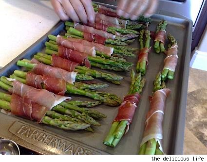 Slice each prosciutto slice in half lengthwise, and wrap around 1-2 stalks of asparagus. Grill either directly on the heat or on a metal grill sheet with holes until done ~ 15 minutes. You want them to be cooked, but not too soft.