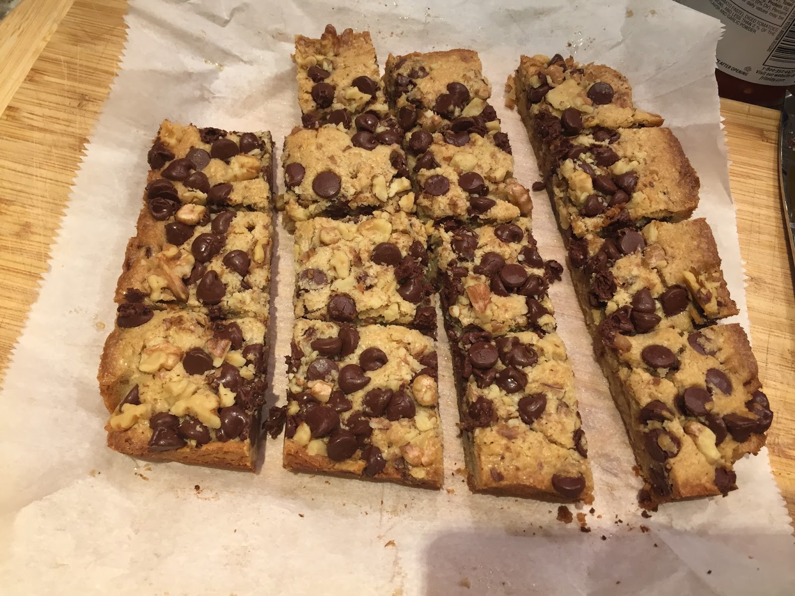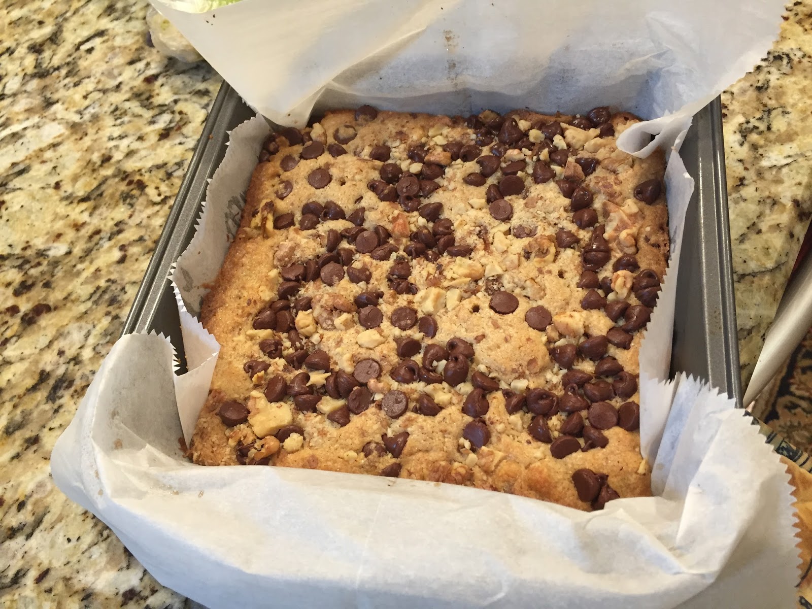 Set pan on a wire rack, and let cool completely. Using parchment overhang, lift blondies from pan, and transfer to a cutting board; cut into 16 squares. And no fair counting the squares below – I can’t imagine why there are only 15… 😉