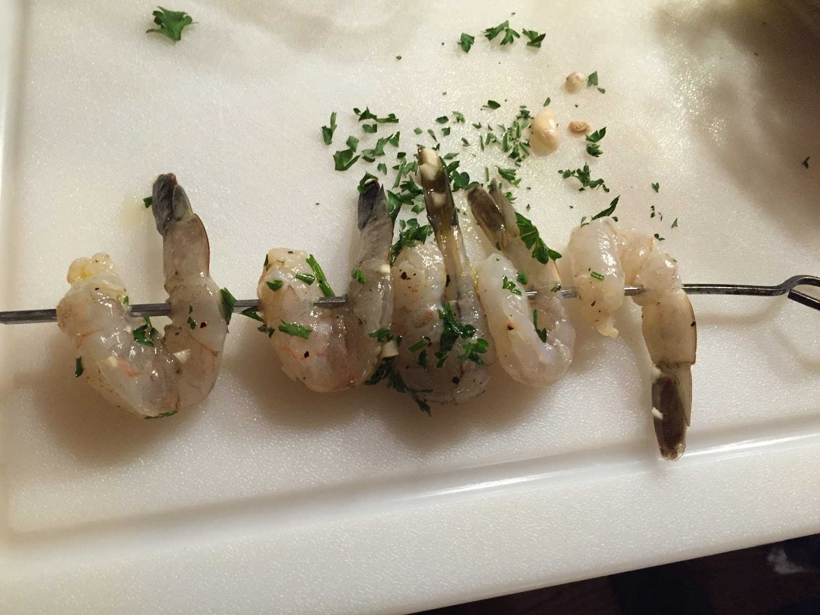 Mix to coat. Thread shrimp on metal or soaked wooden skewers, running skewer through the body once near the tail and once near the head end of each shrimp so it looks like the letter C.