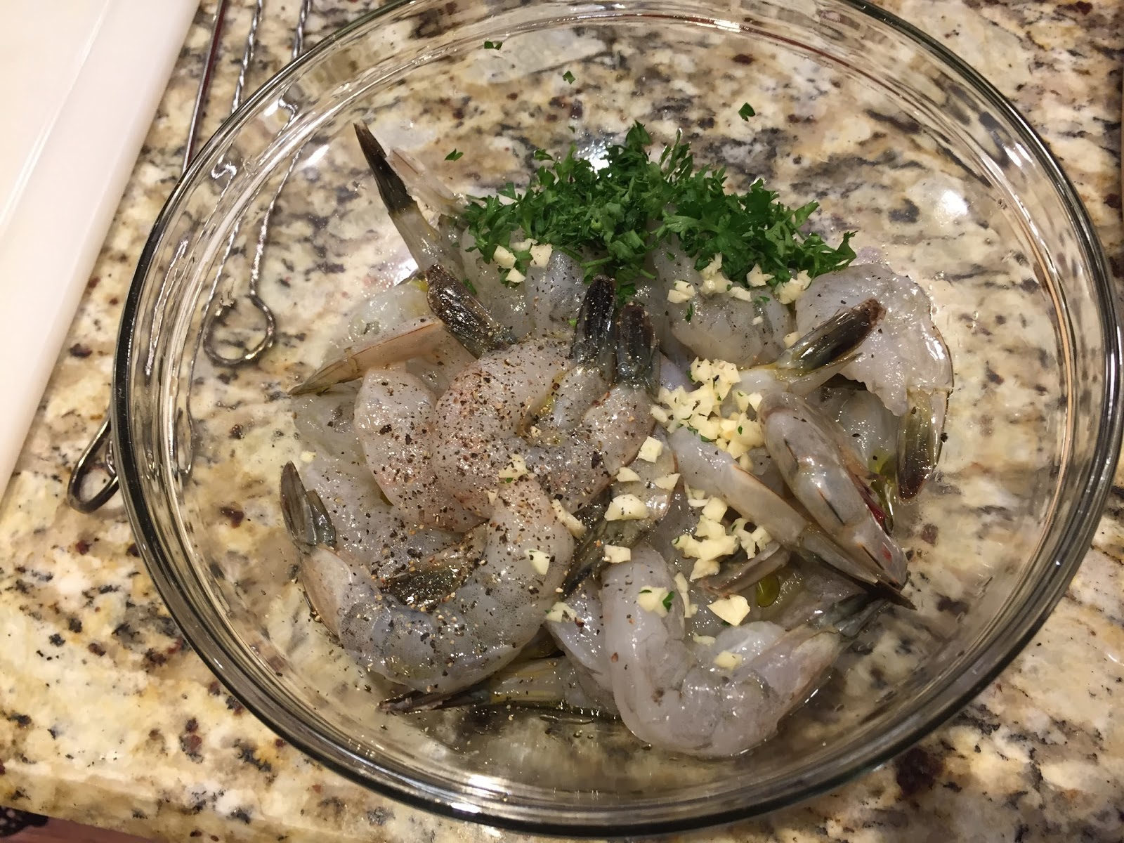 Return shrimp to bowl. Add olive oil, parsley, lemon peel, garlic, and pepper.