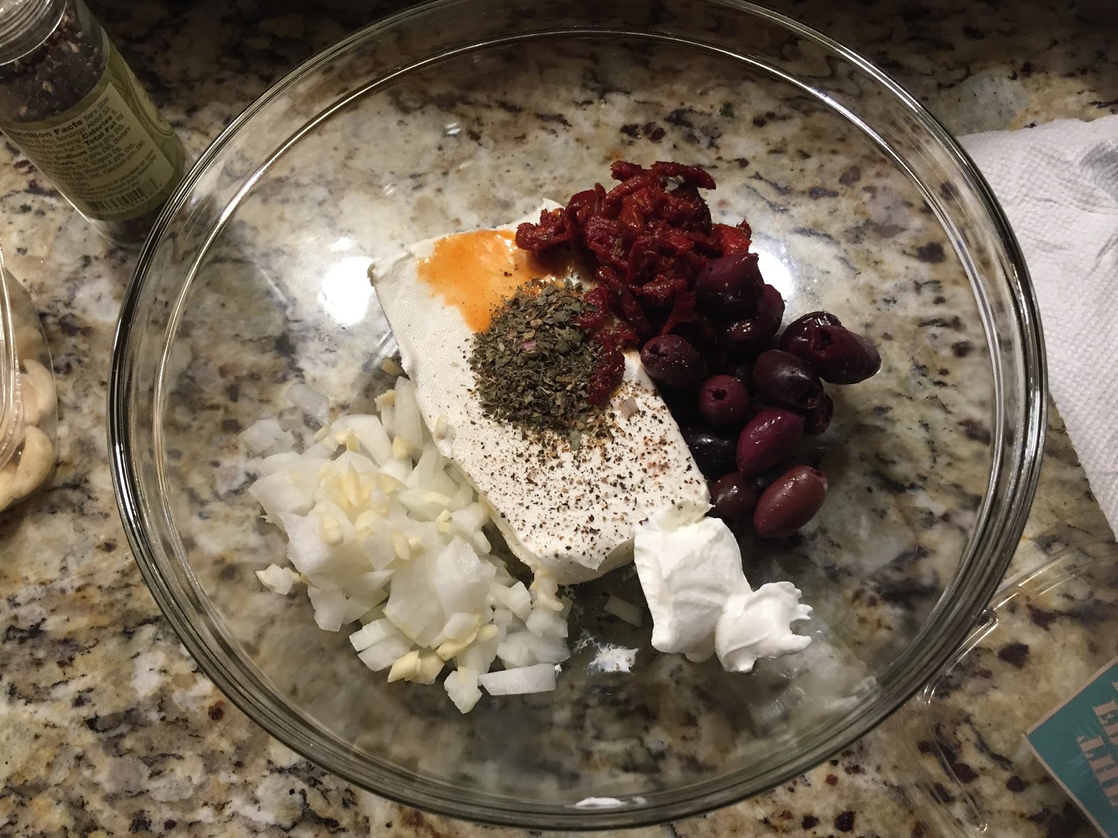 1 small can black olives, chopped and drained (I used 1/3 cup chopped kalamata olives here)
