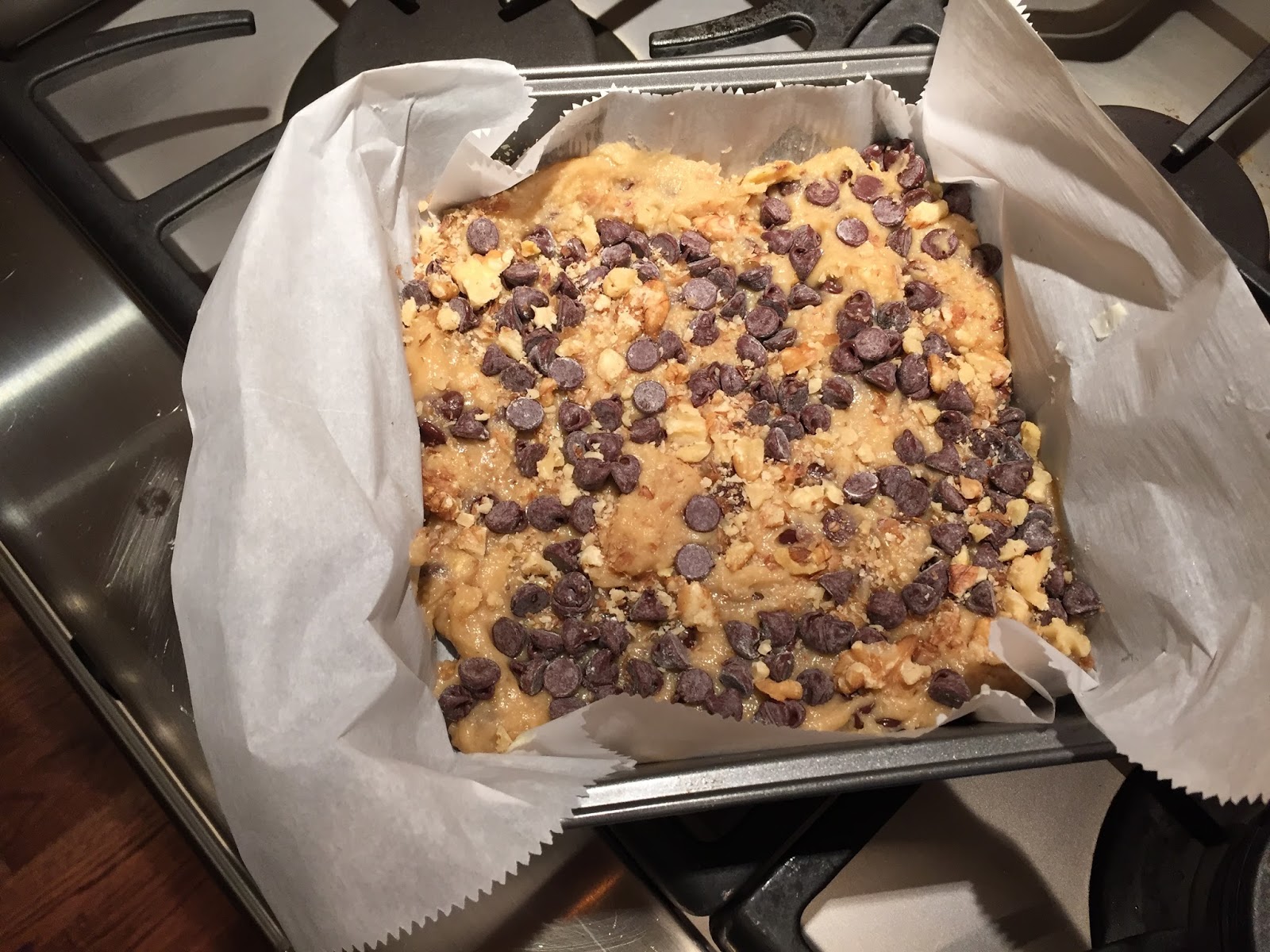Fold in 1/2 cup each chocolate chips and walnuts. Transfer batter to prepared pan; smooth top. Sprinkle with remaining chocolate chips and walnuts.