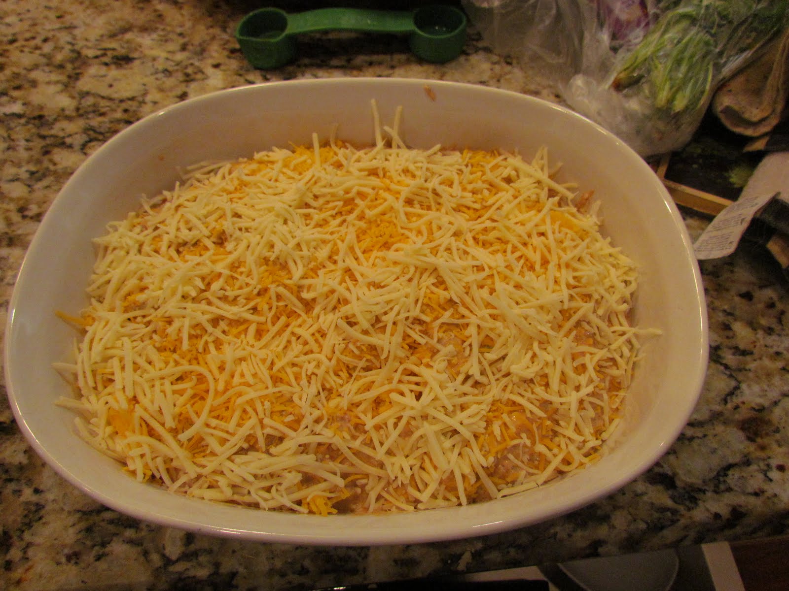 Pour the mixture into a baking dish and top with the reserved cheese.