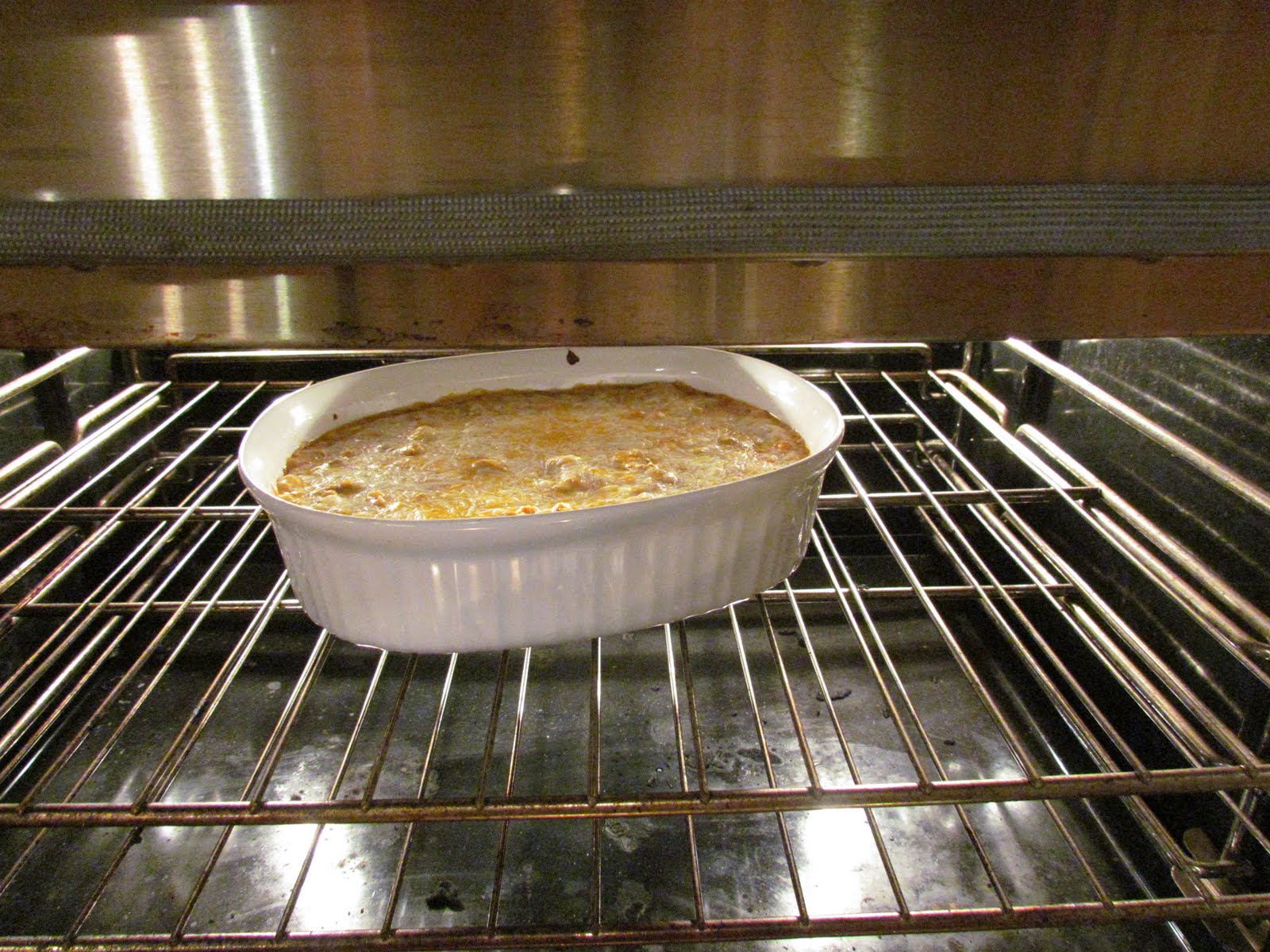 Bake in a preheated 350F oven until it is bubbling on the sides and golden brown on top, about 20-30 minutes.
