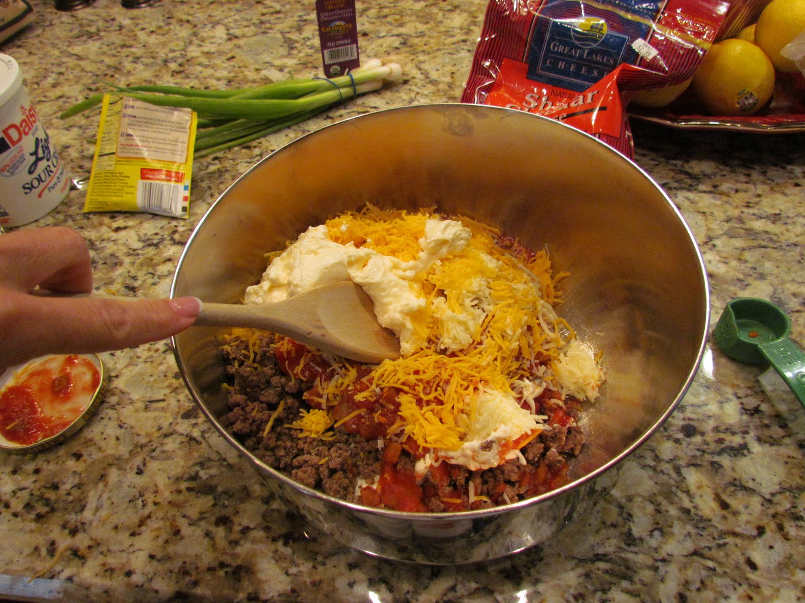 Mix everything in a large bowl, reserving some of the cheese.
