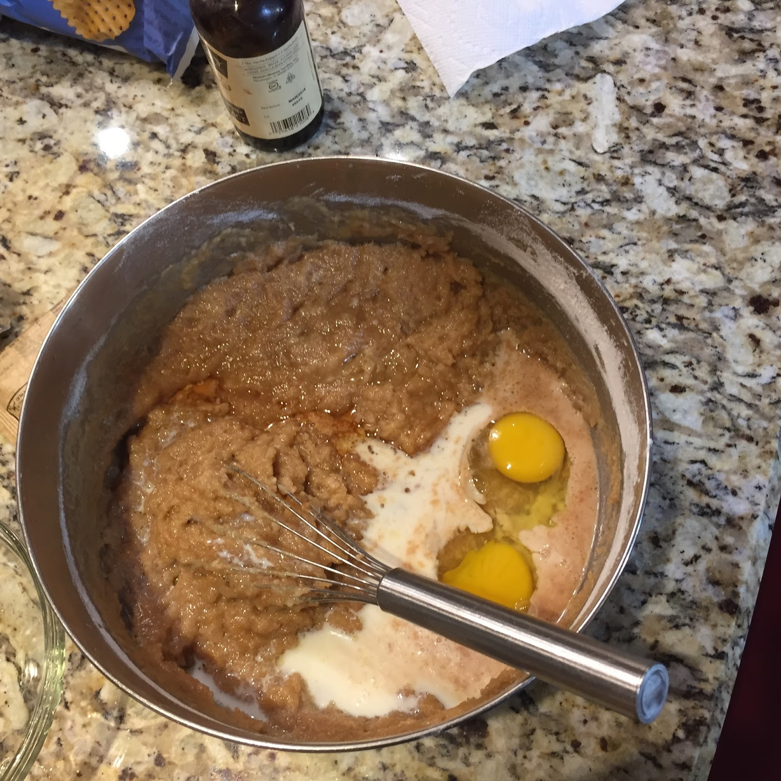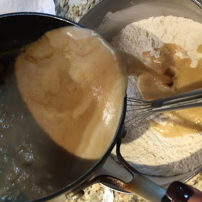 Combine 2 sticks butter, 1 cup water and 1/2 cup peanut butter in saucepan and bring to boil.
