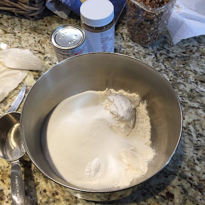 In a large bowl, mix together 2 cups sugar, 1 tsp baking soda, 2 cups flour and 1 tsp salt. Set aside.