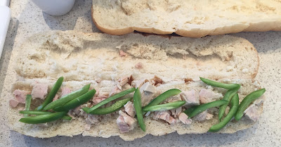 Place the tuna, green pepper, red onion, hard-boiled eggs, olives, and tomato on the bottom side of the bread in that order.