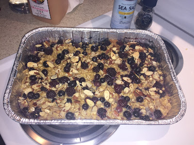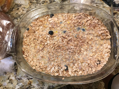 Gently give the baking dish a couple thwacks on the countertop to make sure the milk moves through the oats. Scatter the remaining berries and remaining walnuts across the top.