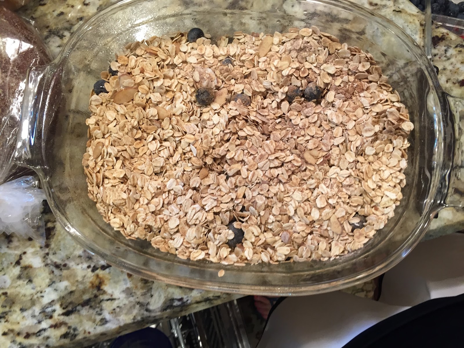 Gently give the baking dish a couple thwacks on the countertop to make sure the milk moves through the oats. Scatter the remaining berries and remaining walnuts across the top.