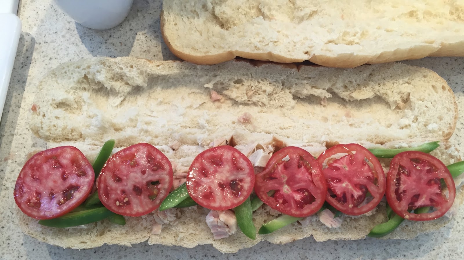 Place the tuna, green pepper, red onion, hard-boiled eggs, olives, and tomato on the bottom side of the bread in that order.