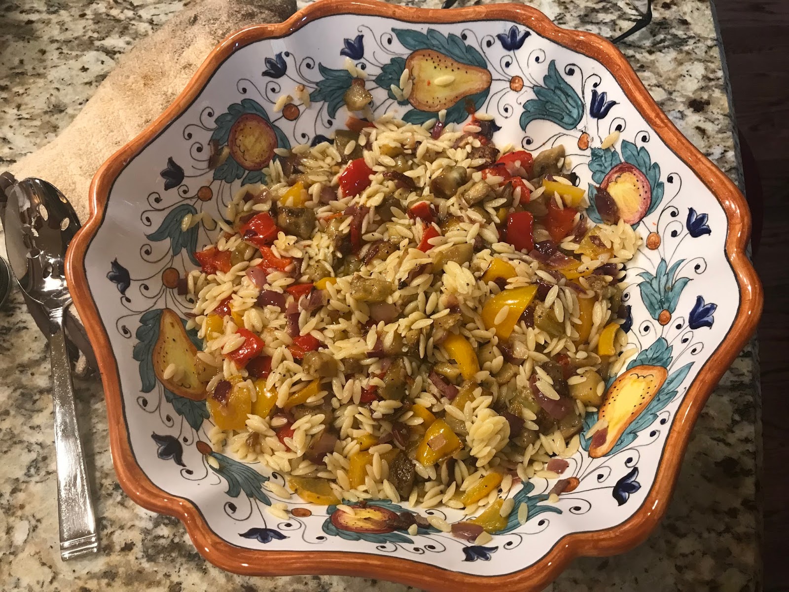 Meanwhile, cook the orzo in boiling salted water for 8 to 9 minutes, until tender. Drain and transfer to a large serving bowl. Add the roasted vegetables to the pasta, scraping all the liquid and seasonings from the roasting pan into the pasta bowl.