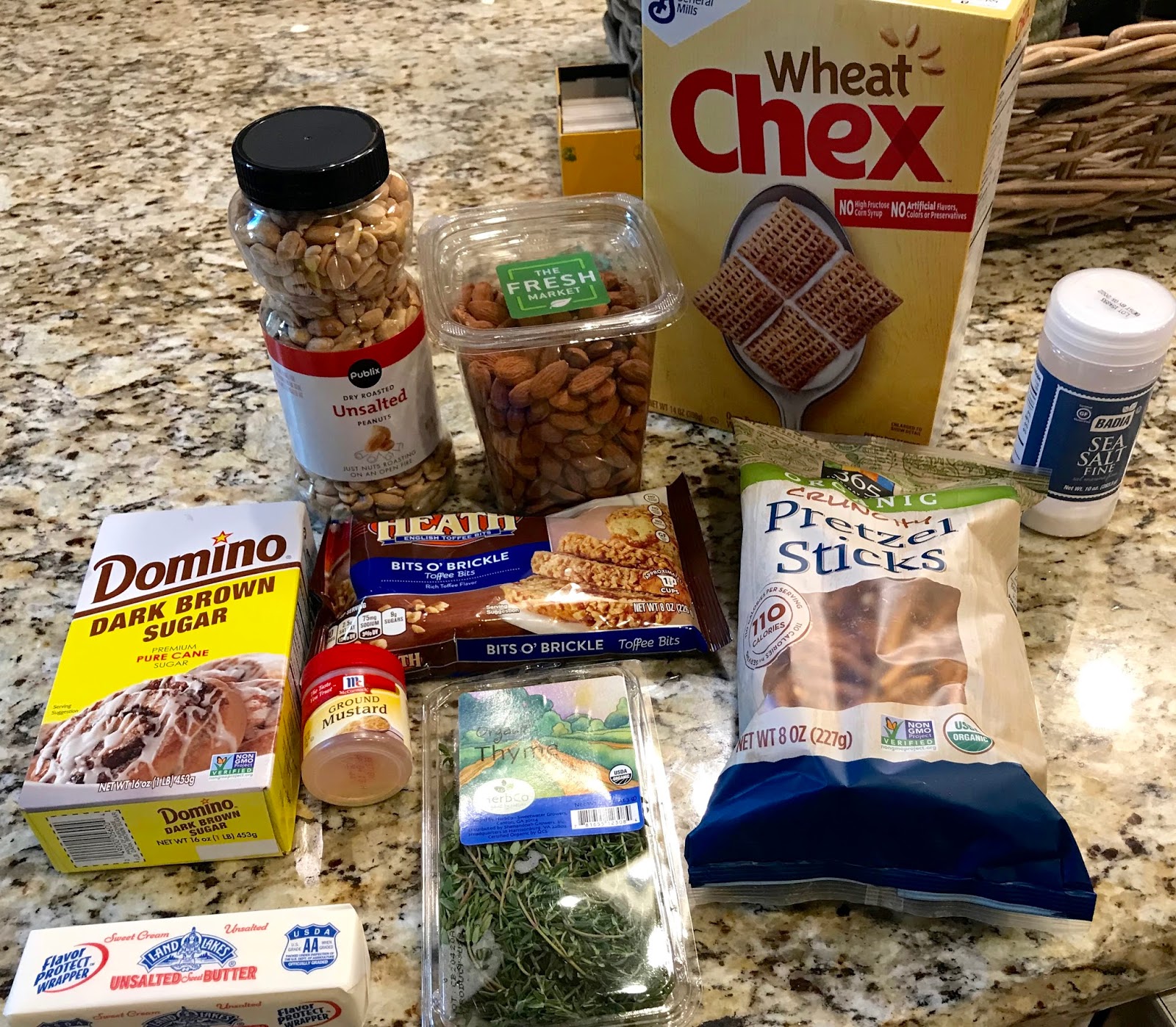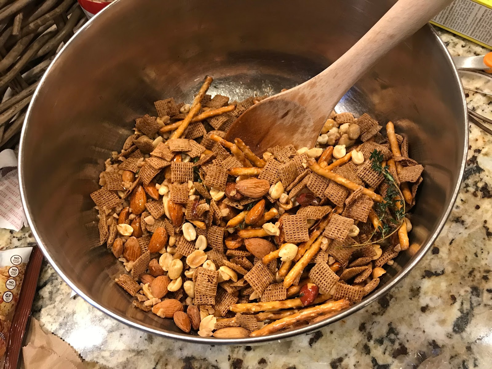 Preheat oven to 325 degrees F. In a large bowl, combine the toasted cereal, pretzels, almonds, peanuts, and toffee bits.