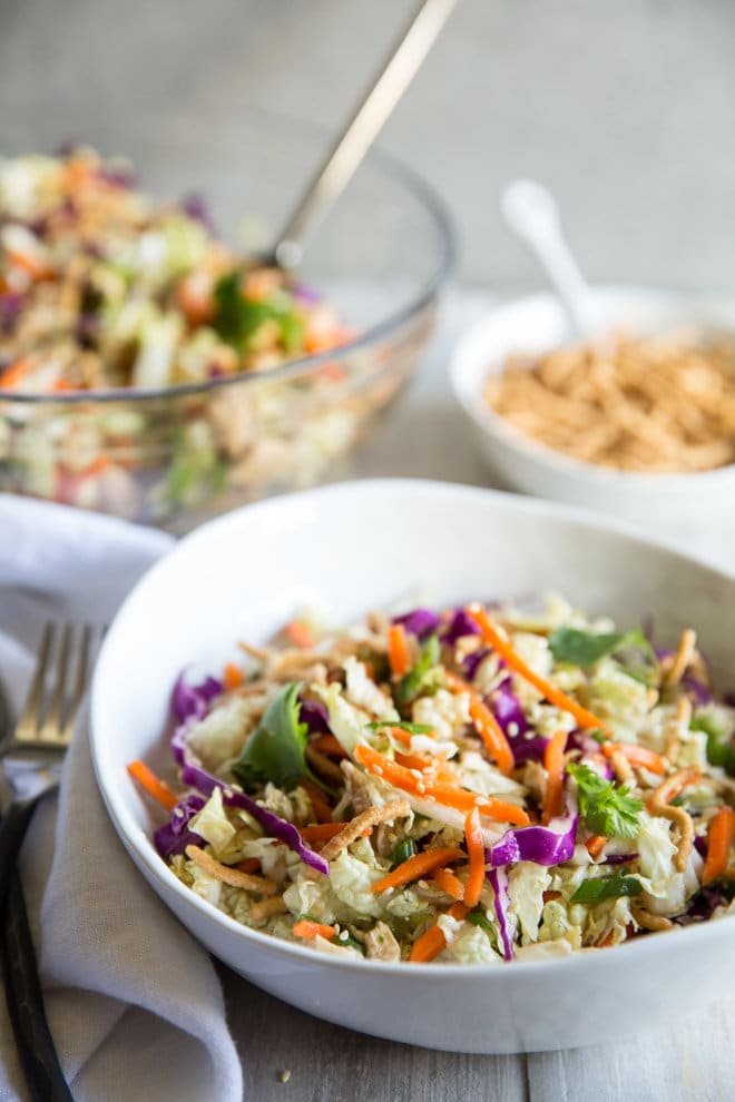 In a large bowl, combine the chicken, cabbage, carrots, scallions, and cilantro.