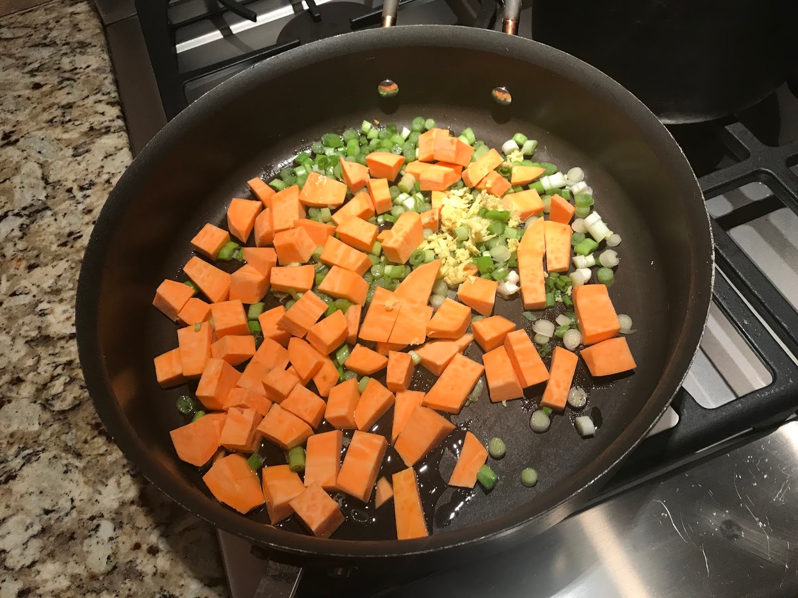 While rice cooks, heat oil in a 12-inch heavy nonstick skillet over moderately high heat until hot but not smoking and sauté scallions, ginger, and sweet potato, stirring, until coated well, about 2 minutes.