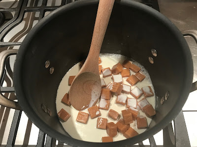 In the meantime, make your buttercream by first melting the caramel candies and heavy cream in a small saucepan over medium heat. Stir occasionally so the cream doesn’t boil. This step takes a few minutes.