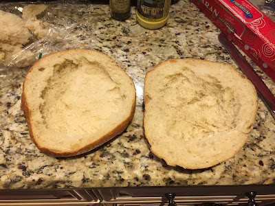 Then cover and chill at least 2 hours (overnight is better!). Cut bread in half horizontally, and scoop out the bottom, leaving about a 1/2 inch thick shell.