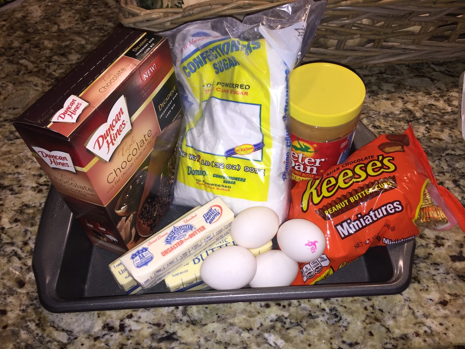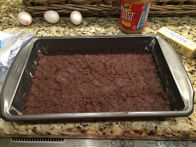 Bake for approximately 50 minutes. Make sure you do not over bake as the center should be gooey. Let set for about 30 minutes or until the peanut butter layer cools and thickens.