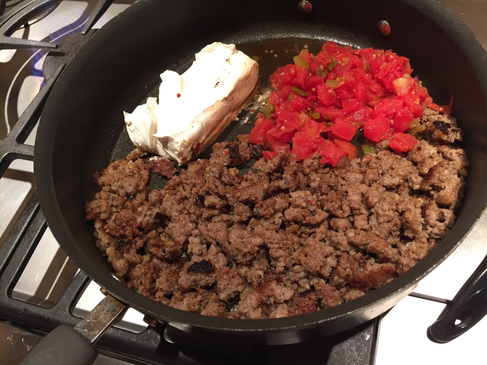 Drain diced tomato and green chiles, reserving 1/4 cup liquid. Stir together sausage, diced tomato and green chiles, reserved liquid, and cream cheese.