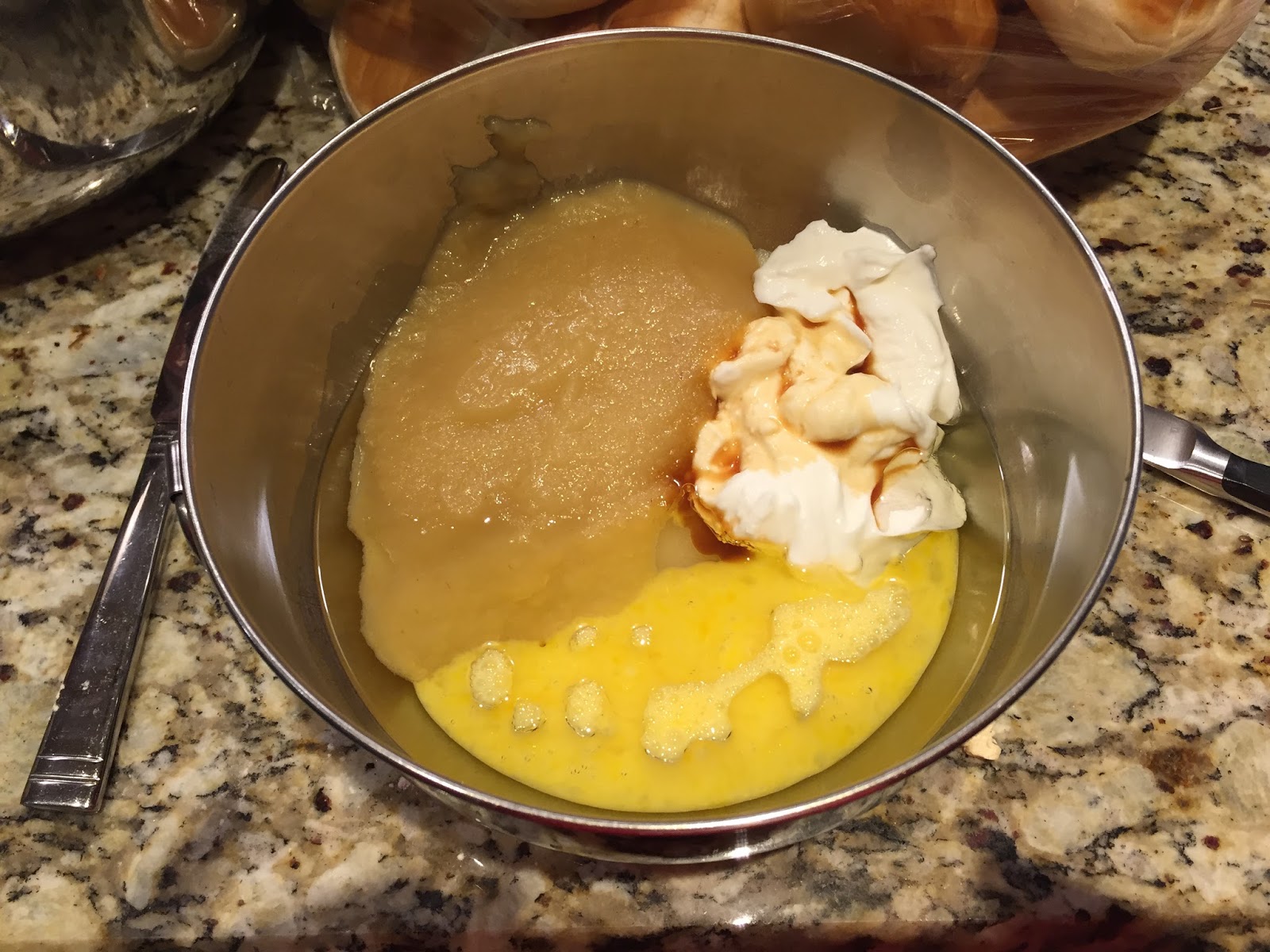 Then whisk together the 1 cup powdered sugar and 1/4 cup of applesauce for the glaze.