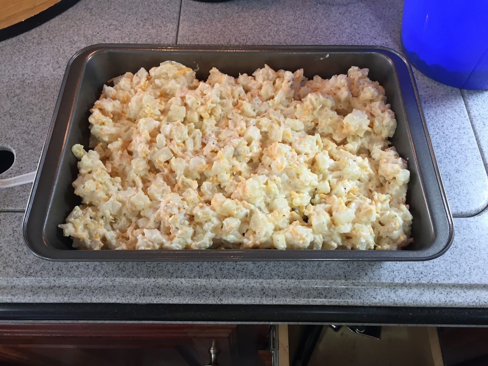 Bake at 350 degrees for 1 hour, uncovered. HINT: Let the hash browns thaw a little before mixing.
