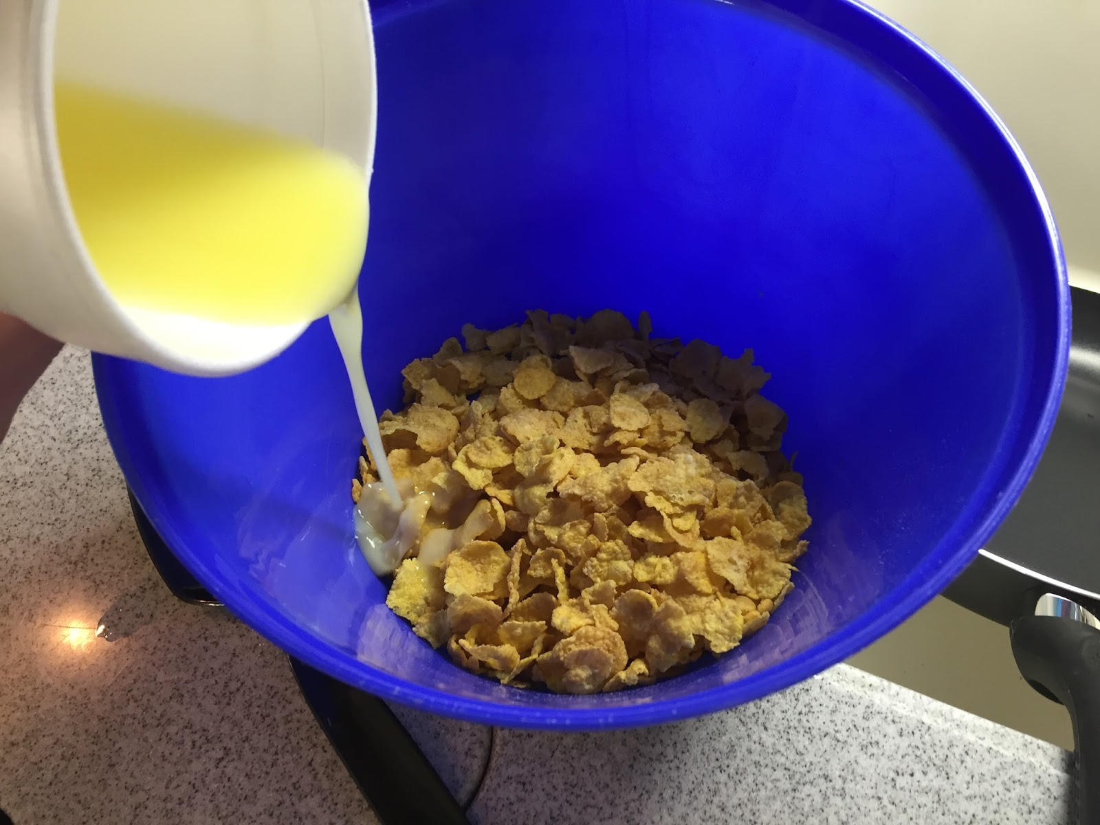 Mix all ingredients except corn flakes and 1/4 cup butter.