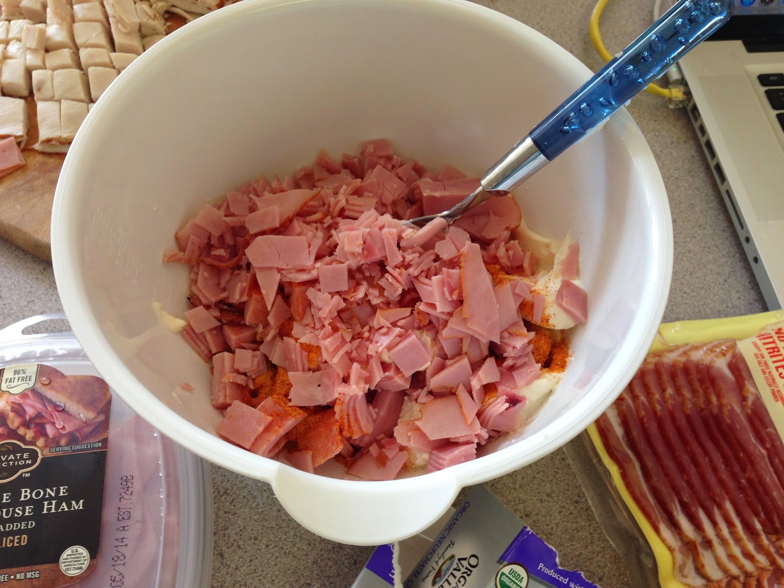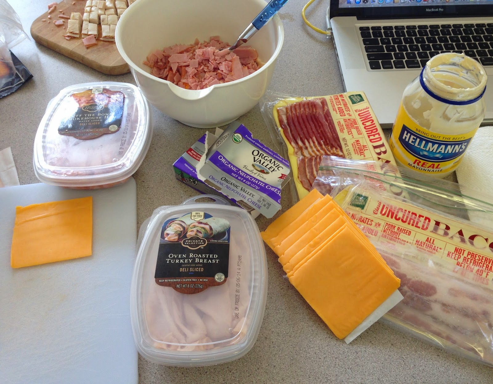 Add the turkey, ham, cream cheese, American cheese, mayo and seasoning salt to a slow cooker or a baking dish.