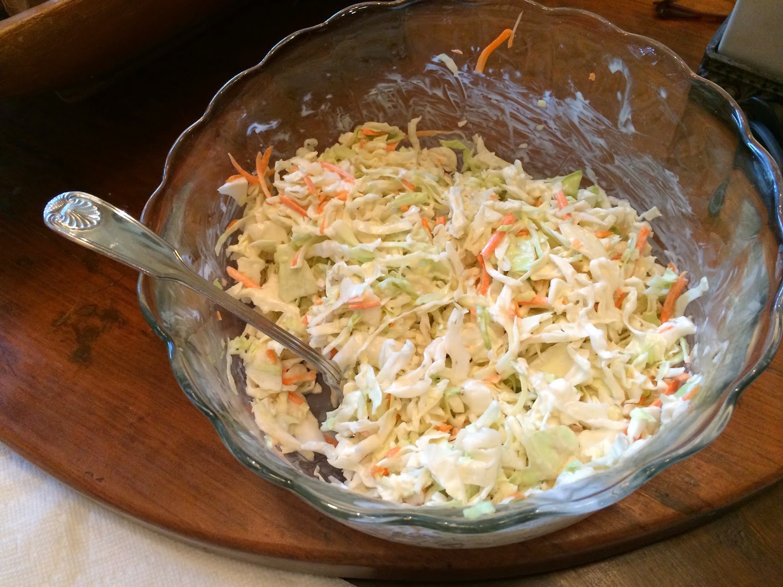 Simply throw a bag of coleslaw in a bowl. Add a couple of heaping spoonfuls of veganaise, 1-2 tsp of lime juice and salt generously. Serve immediately.