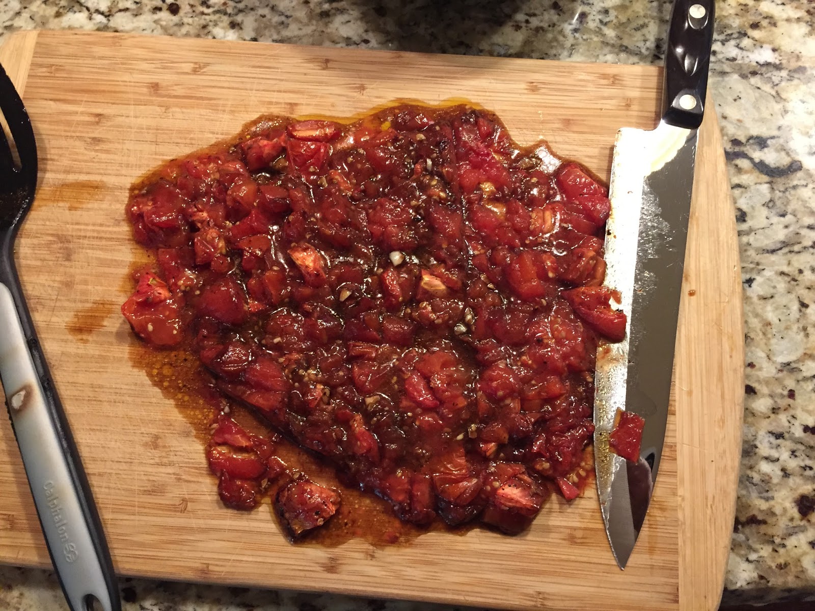 Roast for about 25 minutes, or until the tomatoes slump and the juices are bubbling. Remove pan from the oven and set aside to cool a bit.