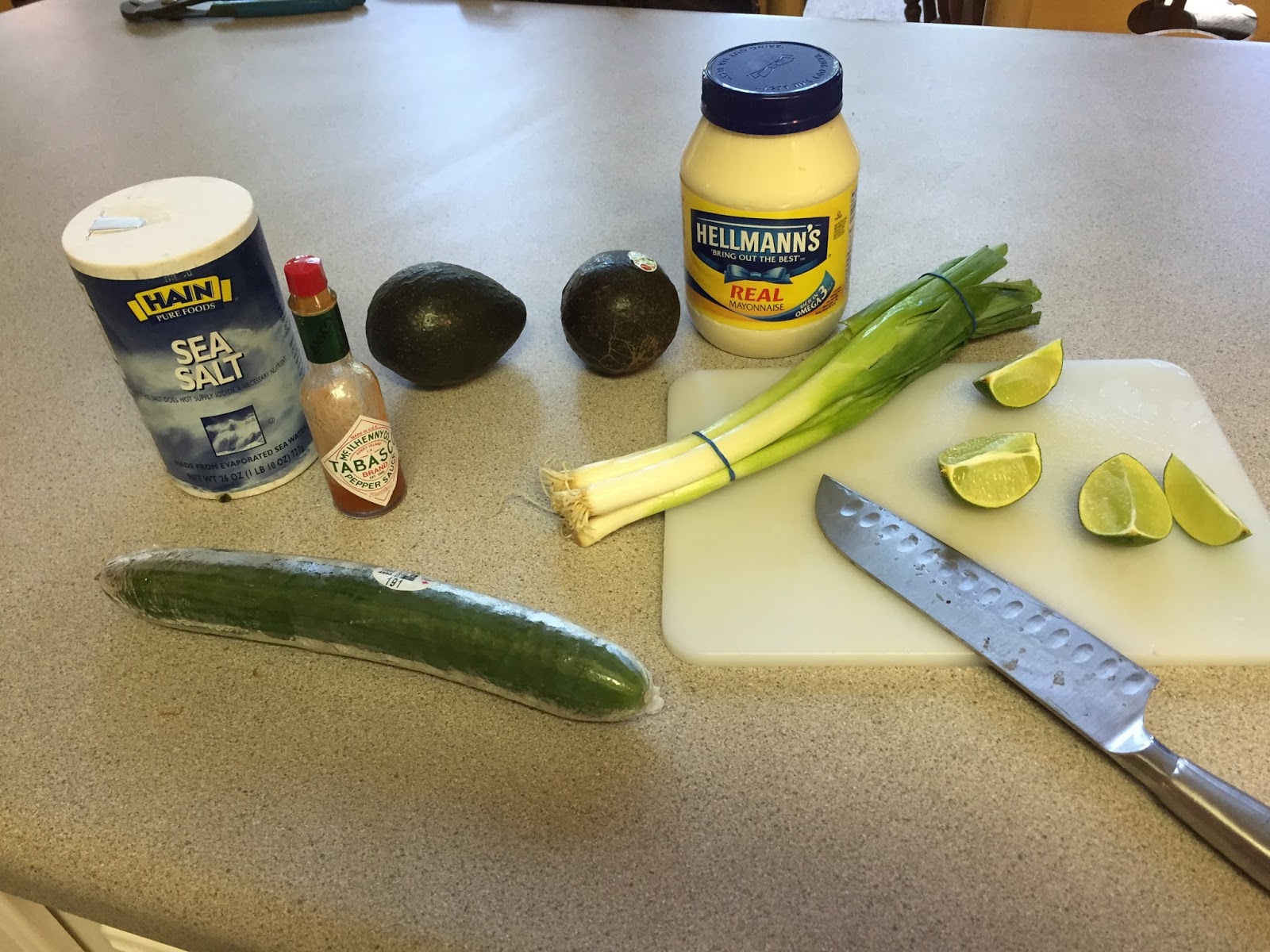 Combine cucumber, scallions and avocado in a bowl. Either whisk together mayo, lime and seasonings and then drizzle over the salad. OR throw everything in a bowl and toss, adjusting levels of salt and lime to taste.