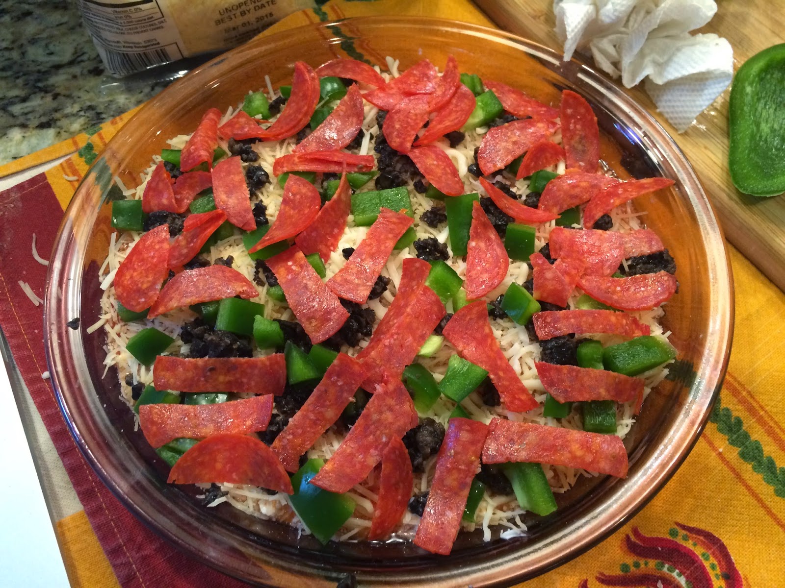 Spread the pizza sauce on top and sprinkle on the cheese, pepperoni, green pepper and olives.