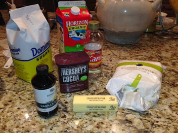 For the frosting: In a large saucepan on medium high heat, whisk together 1 cup sugar and 1/2 cup cocoa powder.