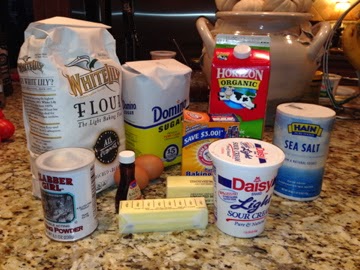 Then slowly pour in the warm milk liquid while beating the mixture. Make sure you pour it in very slowly so the eggs don’t turn into scrambled eggs. Once the milk has been added, the mixture should be smooth. Then add the 1/2 cup sour cream, 1 tsp salt, 1 tsp baking powder, 1 tsp almond extract, and 1/4 tsp baking soda.