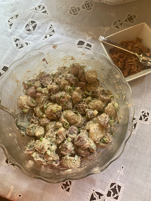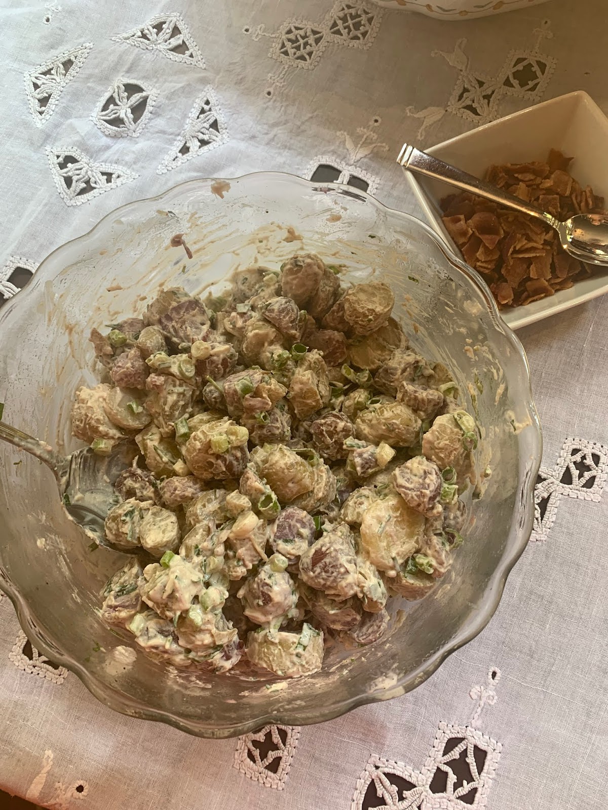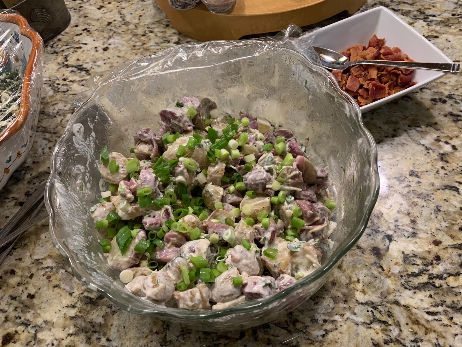 Add the potatoes to the bowl and gently mix. Transfer to a serving bowl or cover with plastic and refrigerate until ready to serve. Garnish with the bacon and scallions before serving. (I served mine with bacon on the side, since one of our family members doesn’t like it)