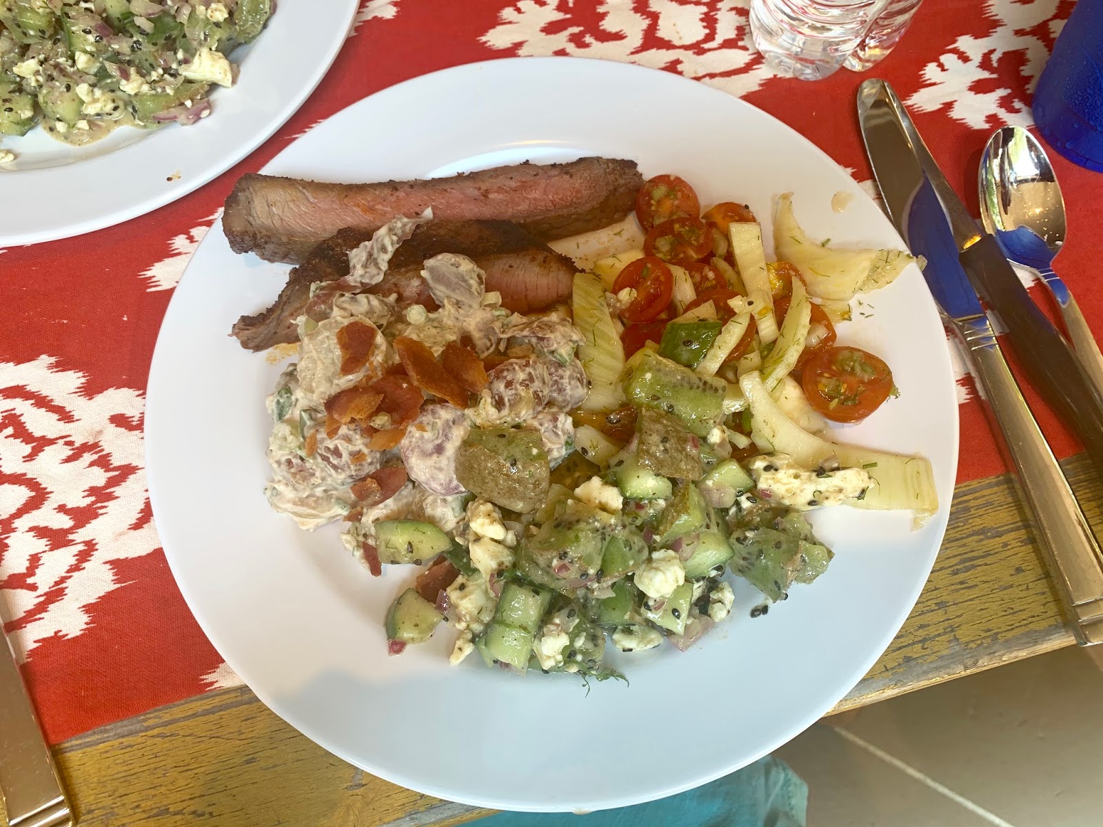 This menu is perfect for an outside celebration by the pool or just in your back yard. We grilled a London Broil, sliced it thin and then served it with a tomato fennel salad. Other sides were delicious and cold and the drink du jour was a Boozy frozen lemonade. Dessert was wonderful strawberry shortcake!