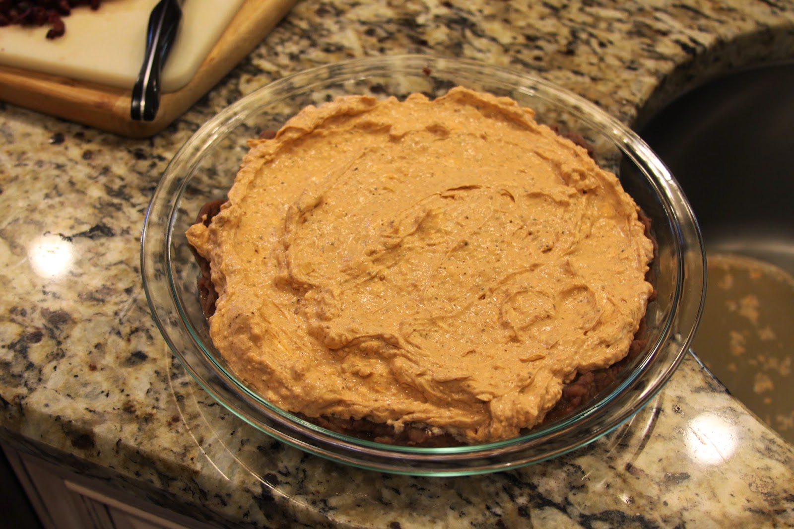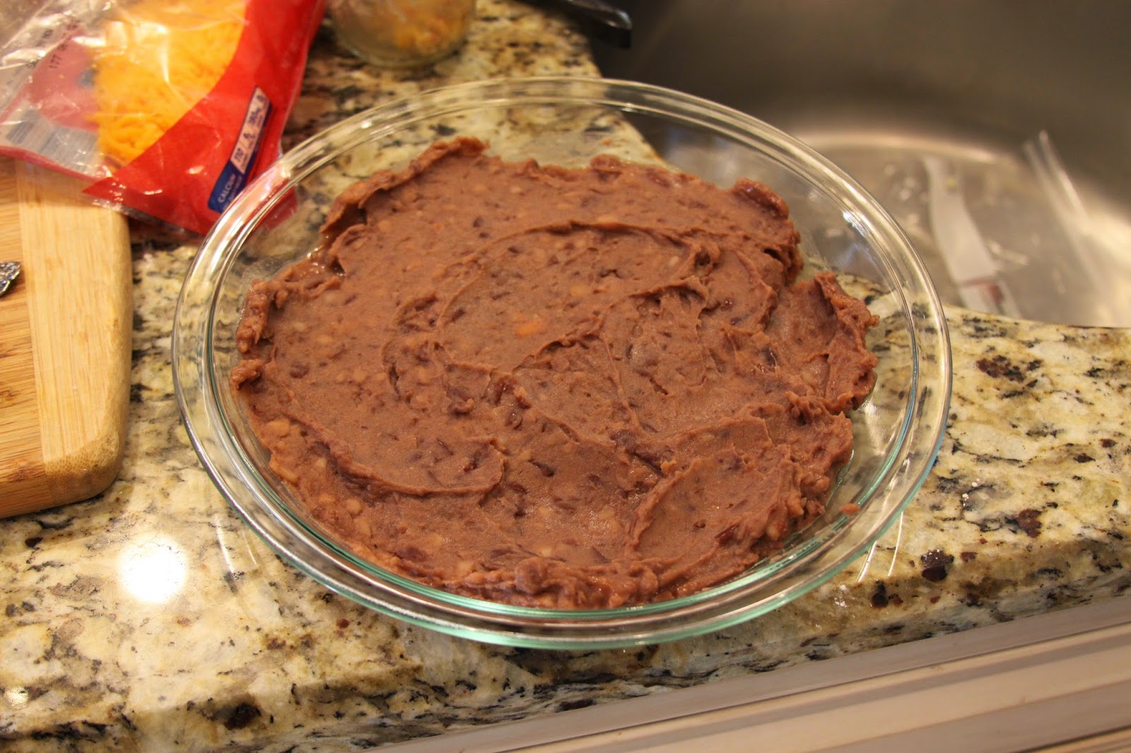 Spread the refried beans in a stone baker (or any 9-inch baking dish).
