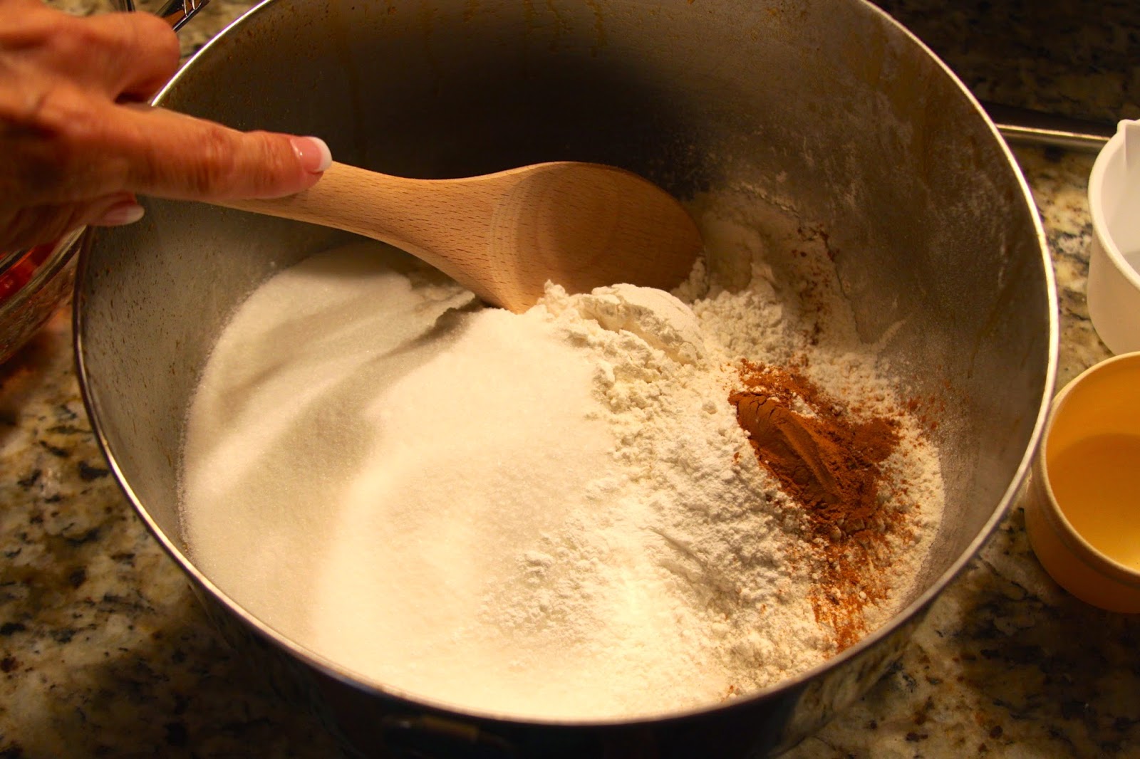 In a large mixing bowl, sift together flour, sugar, cinnamon, salt, and baking powder.