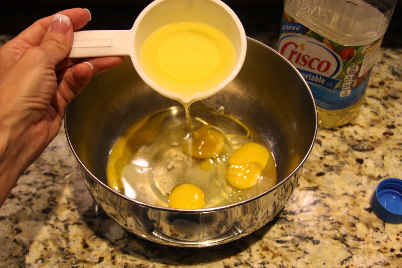 In a medium mixing bowl, stir together eggs and oil.