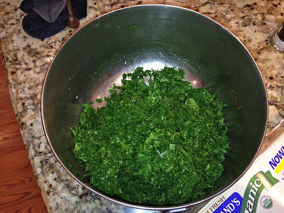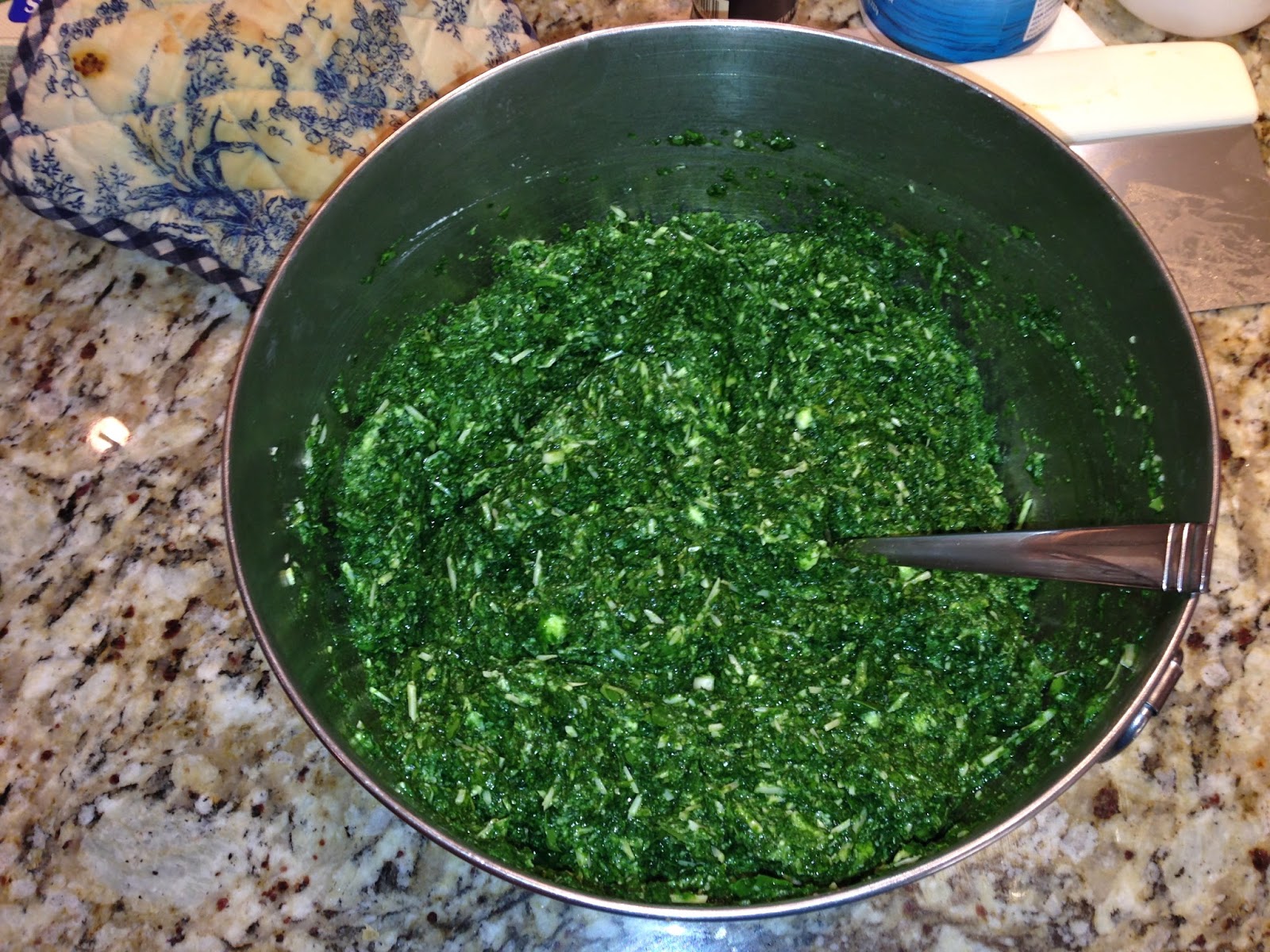 While the spinach wilts, whisk together the 9 eggs in a large bowl. Drain spinach & squeeze off excess liquid, then add to the eggs.