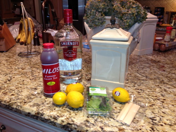 Make a simple syrup by heating the water and sugar over medium-low heat in a pan until sugar is incorporated and mixture is slightly thickened. Add 3 drops of mint extract. Alternatively, you can rub mint leaves between your fingers to release some oils, and add them to the simple syrup for a few minutes to release their flavor. Add juice of 2.5 lemons and 4 T. vodka.