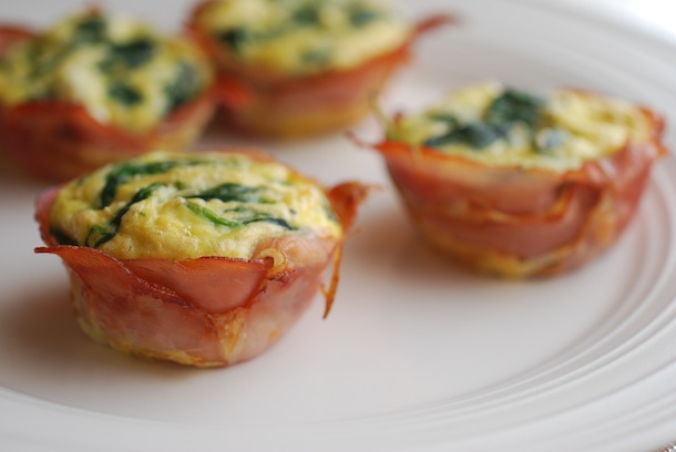 Preheat oven to 400 degrees F. Spray or brush a muffin tin with oil, then line each cup with a slice of ham being sure to seal it up as much as possible (sometimes it helps to cut the ham slightly). Don’t worry if there is overlap on the sides.